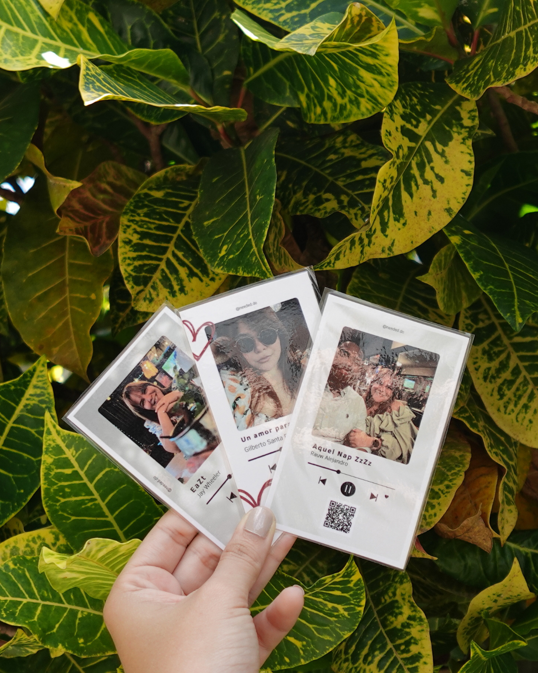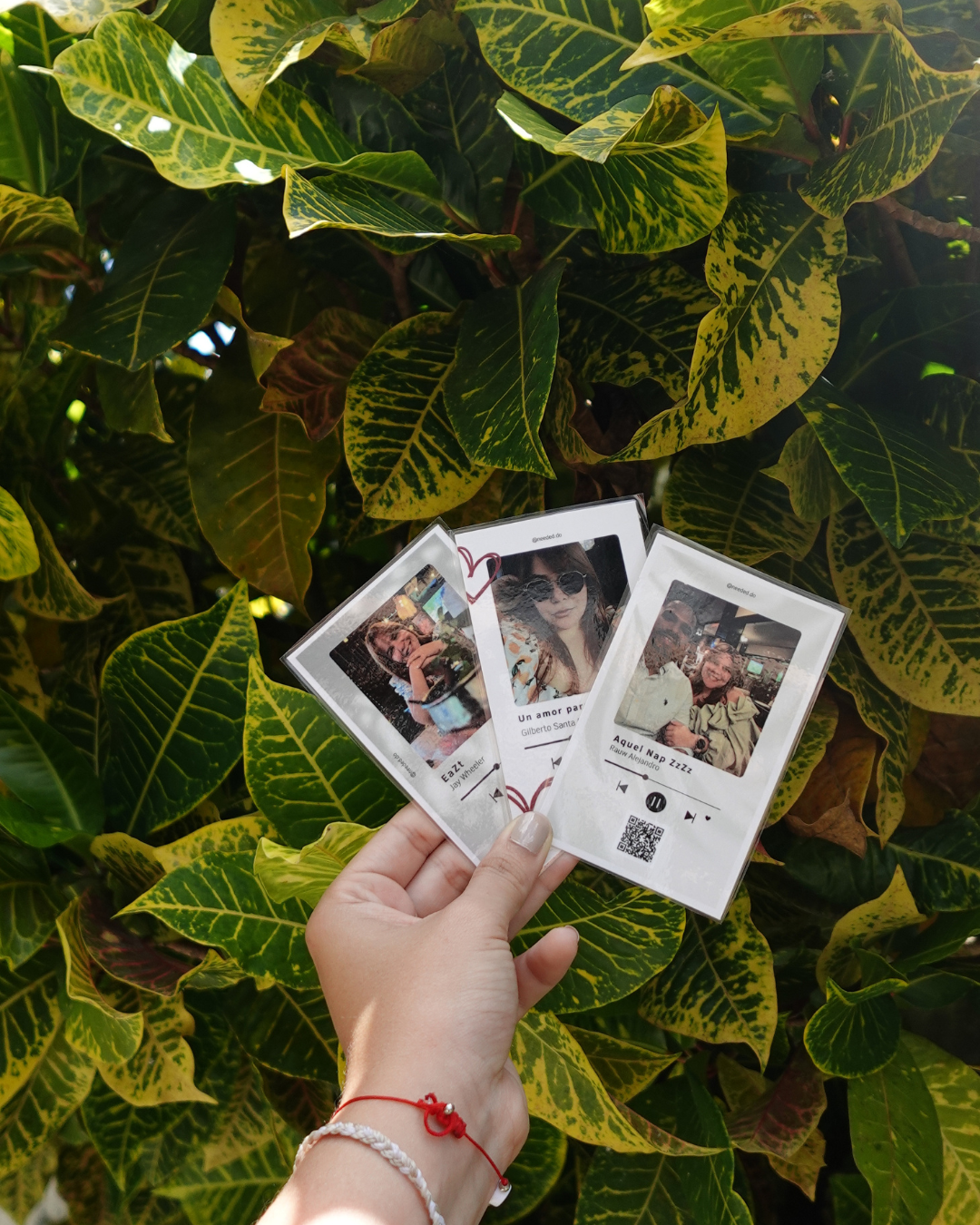Tarjeta pequeña del tamaño de una foto polaroid. Con el diseño, foto y canción que desee. Debe elegir entre el código de Spotify o Youtube